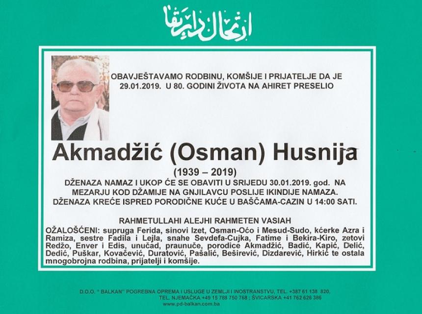 Obavještavamo rodbinu, komšije i prijatelje da je dana 29.01.2019. godine u 80-oj godini života na Ahiret preselio Akmadžić (Osman) Husnija.