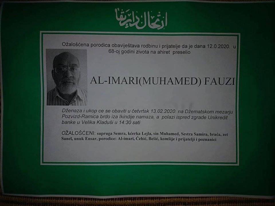 Tužnim srcem i s bolom u duši, obavještavamo rodbinu, komšije i prijatelje da je naš dragi Al-Imari (Muhamed) Fauzi dana 12. februara 2020. godine u 68-oj godini života preselio na Ahiret.
