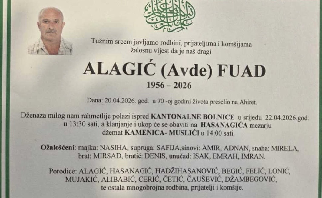 Dženaza milog nam rahmetlije polazi ispred KANTONALNE BOLNICE u srijedu 22.04.2026. god. u 13:30 sati, a klanjanje i ukop će se obaviti na HASANAGIĆA mezarju, džemat KAMENICA - MUSLIĆI u 14:00 sati.