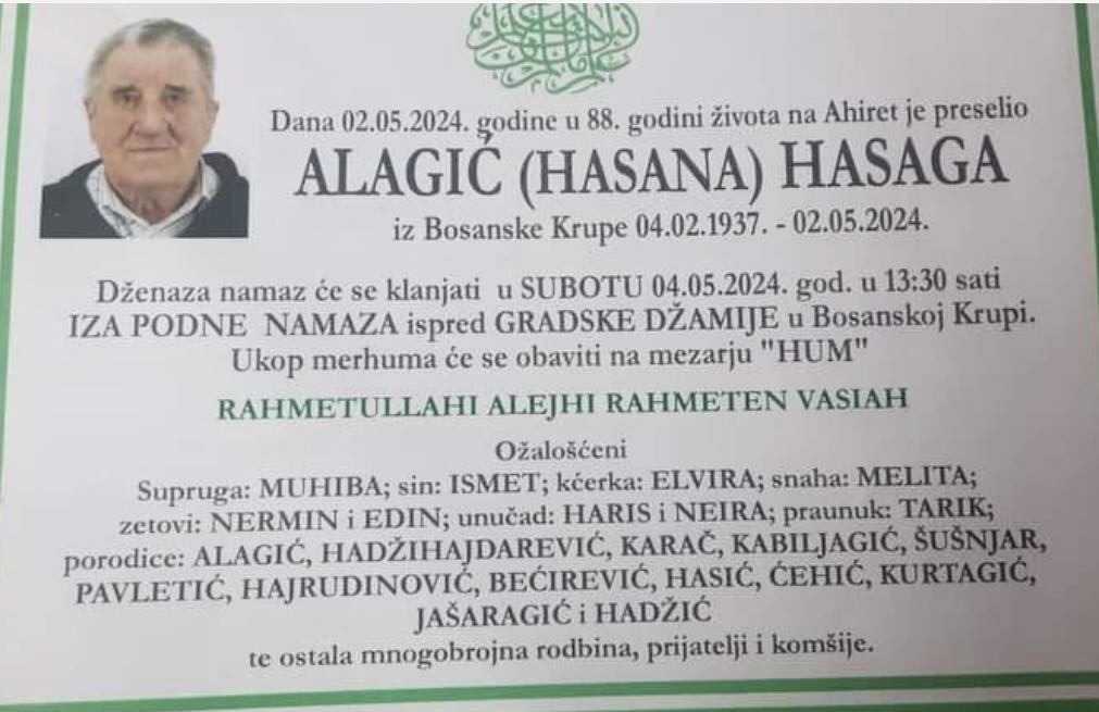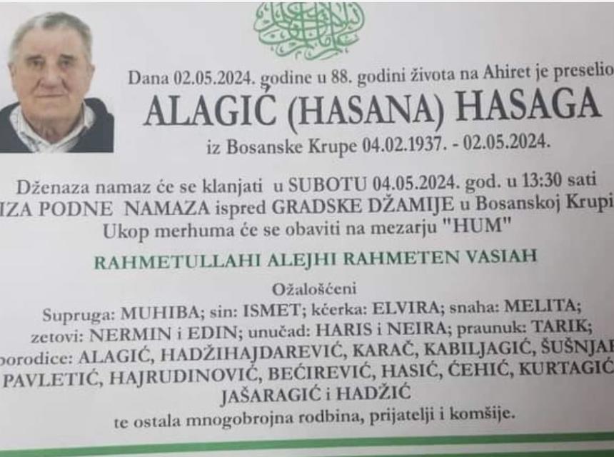 Tužnim srcem obavještavamo rodbinu, prijatelje i poznanike da je dana 02.05.2024. godine u 88. godini na Ahiret preselio Alagić (Hasan) Hasaga.