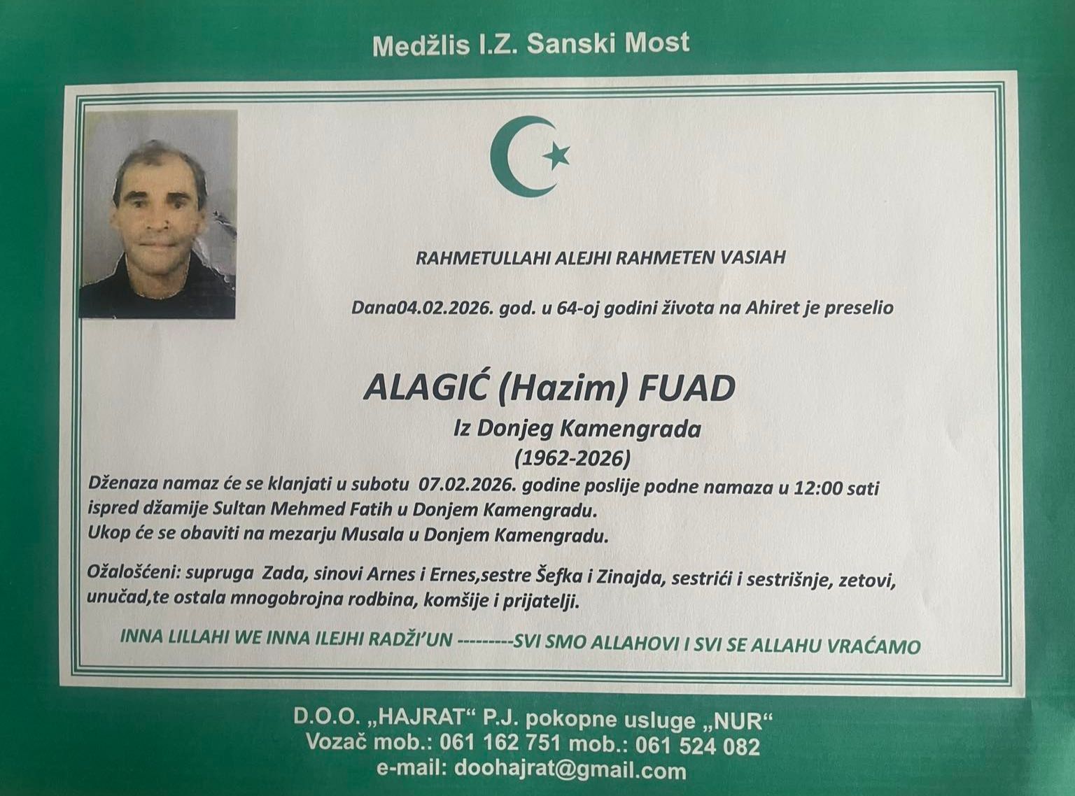 Dženaza namaz će se klanjati u subotu 07.02.2026. godine poslije podne namaza u 12:00 sati ispred džamije Sultan Mehmed Fatih u Donjem Kamengradu.