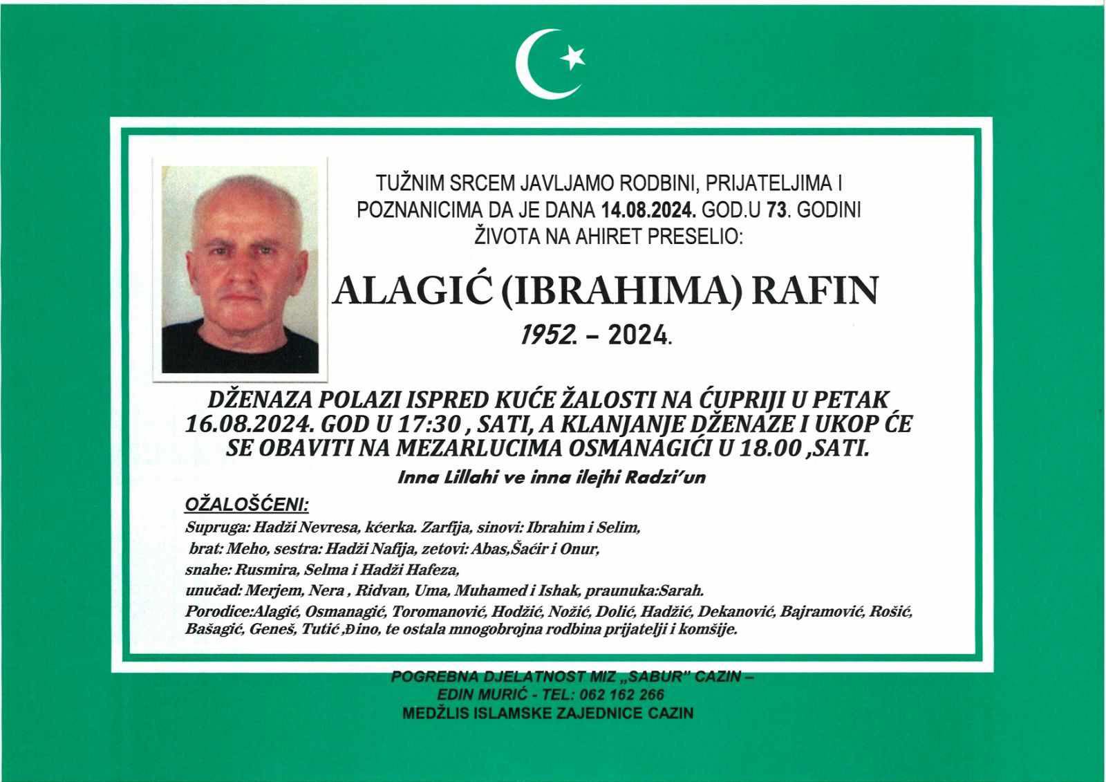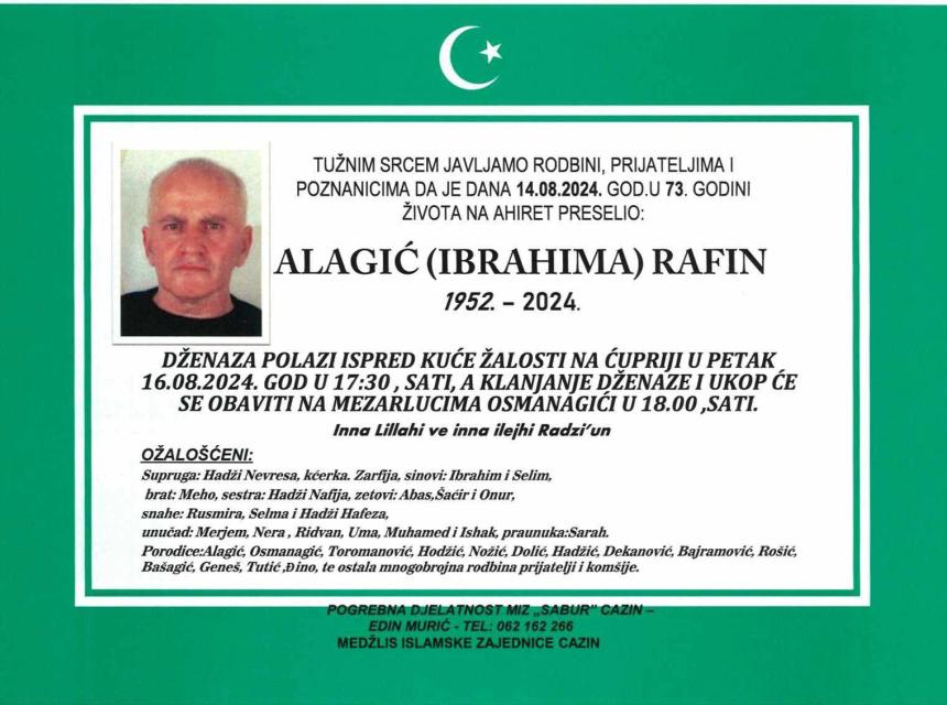 Tužnim srcem i bolom u duši javljamo rodbini, prijateljima i komšijama da je naš dragi Alagić (Ibrahima) Rafin, dana 14.08.2024. godine u 73-oj godini života, preselio na Ahiret.