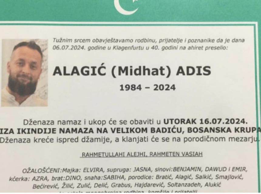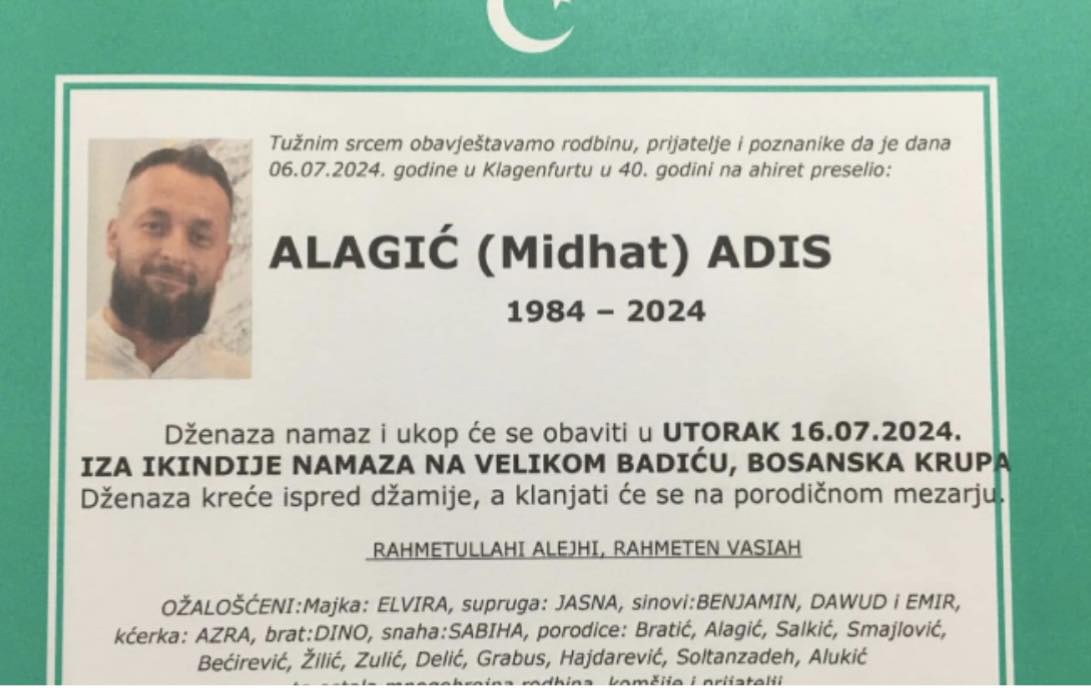 Tužnim srcem obavještavamo rodbinu, komšije i prijatelje da je dana 06.07.2024. godine u Klagenfurtu u 40. godini na ahiret preselio ALAGIĆ (Midhata) ADIS.