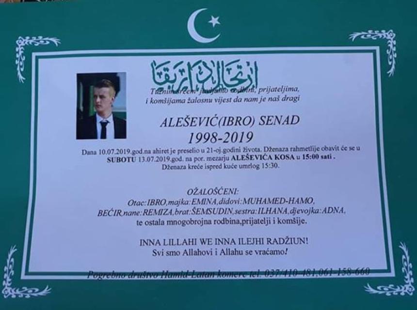 Tužnim srcem javljamo rodbini, prijateljima i komšijama žalosnu vijest da nam je naš dragi Alešević (Ibro) Senad dana 10.07.2019. god. na Ahiret preselio u 21-oj godini života.