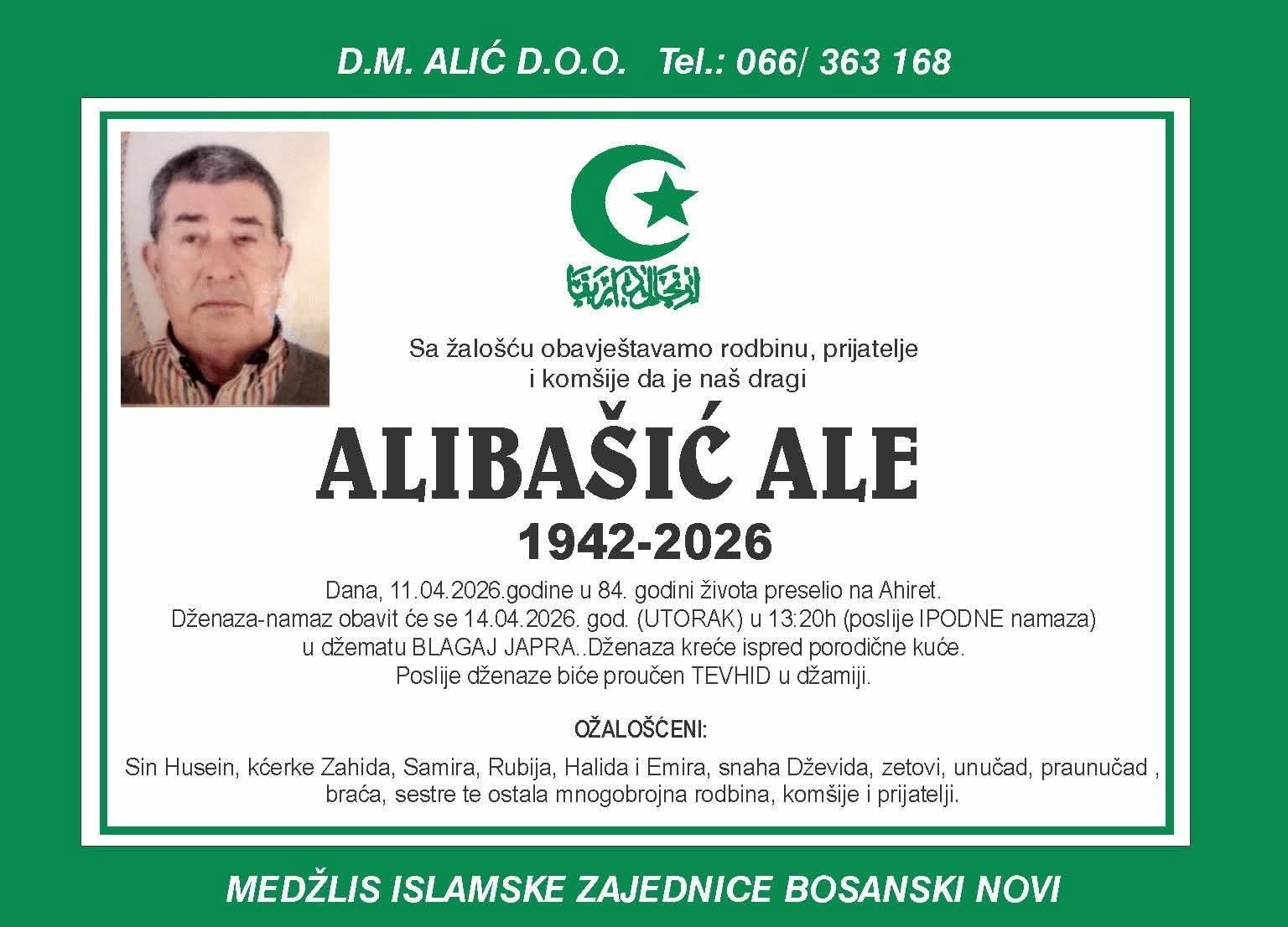 Dženaza-namaz obavit će se 14.04.2026. godine (utorak) u 13:20h (poslije ikindije namaza) u džematu Blagaj Japra. Dženaza kreće ispred porodične kuće.