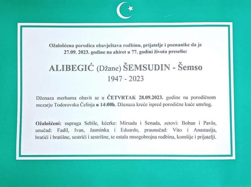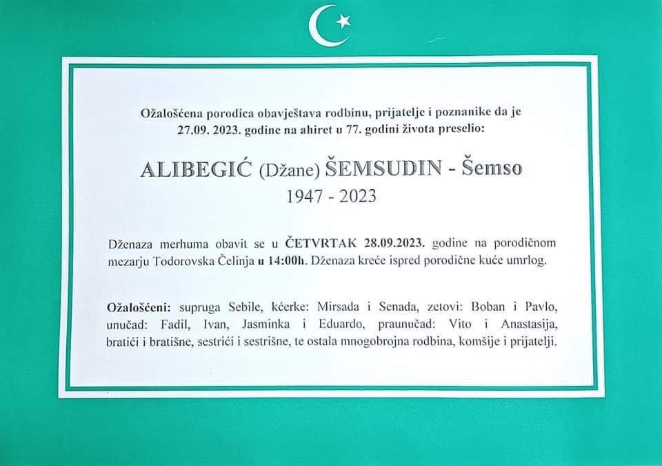 Ozaloscena porodica obavjestava rodbinu, prijatelje i poznanike da je 27.09. 2023. godine na ahiret u 77. godini zivota preselio Alibegić (Džane) Šemsudin-Šemso