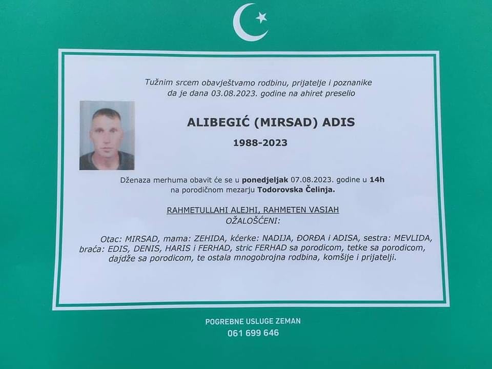 Sa žalošću javljamo rodbini, prijateljima i poznanicima da je naš dragi Alibegić (Mirsad) Adis, dana 03.08.2023.godine preselio na Ahiret.