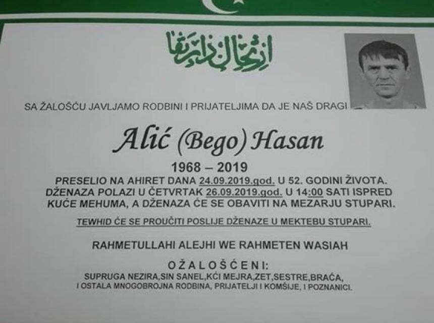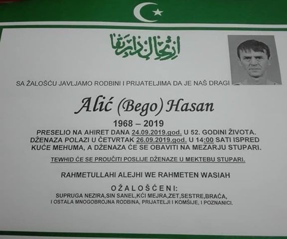 Tužnim srcem i bolom u duši javljamo rodbini, prijateljima, komšijama i poznanicima da je dana 24.09.2019 godine u 52-oj godini života na Ahiret preselio dragi nam Alić (Bego) Hasan.