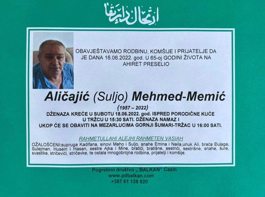 Tužnog srca i s bolom u duši obavještavamo rodbinu, komšije i prijatelje da je naš dragi Aličajić (Suljo) Mehmed- Memić u 65. godini života preselio na Ahiret.