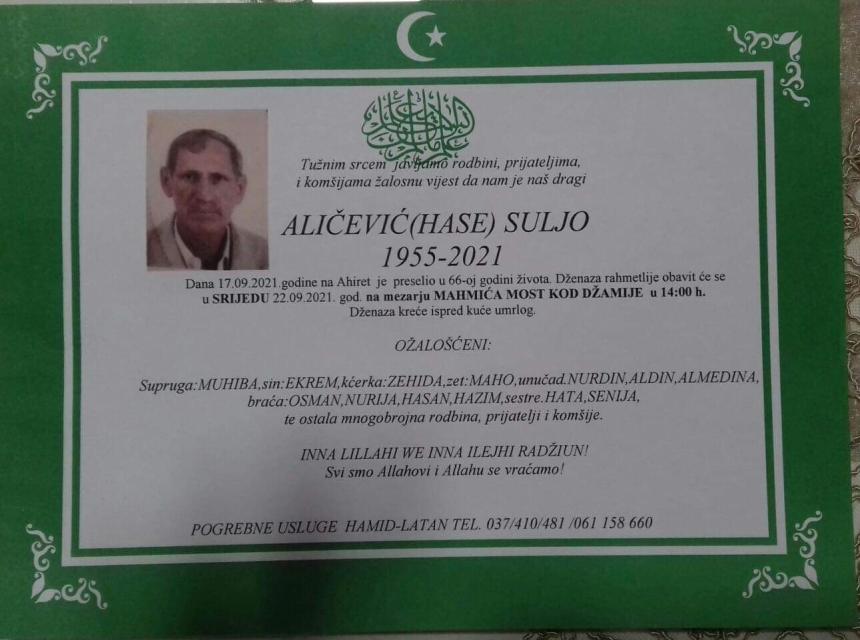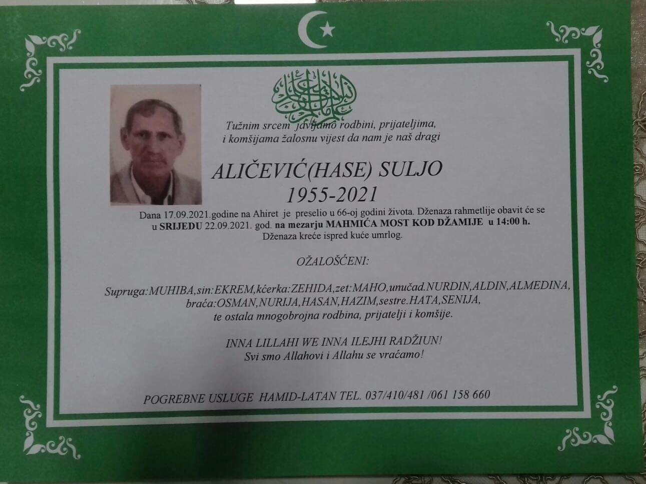 Tužnog srca i s bolom u duši obavještavamo rodbinu, komšije i prijatelje da je naš dragi Aličević (Hase) Suljo, dana 17.09.2021. godine, u 66-oj godini života preselio na ahiret.
