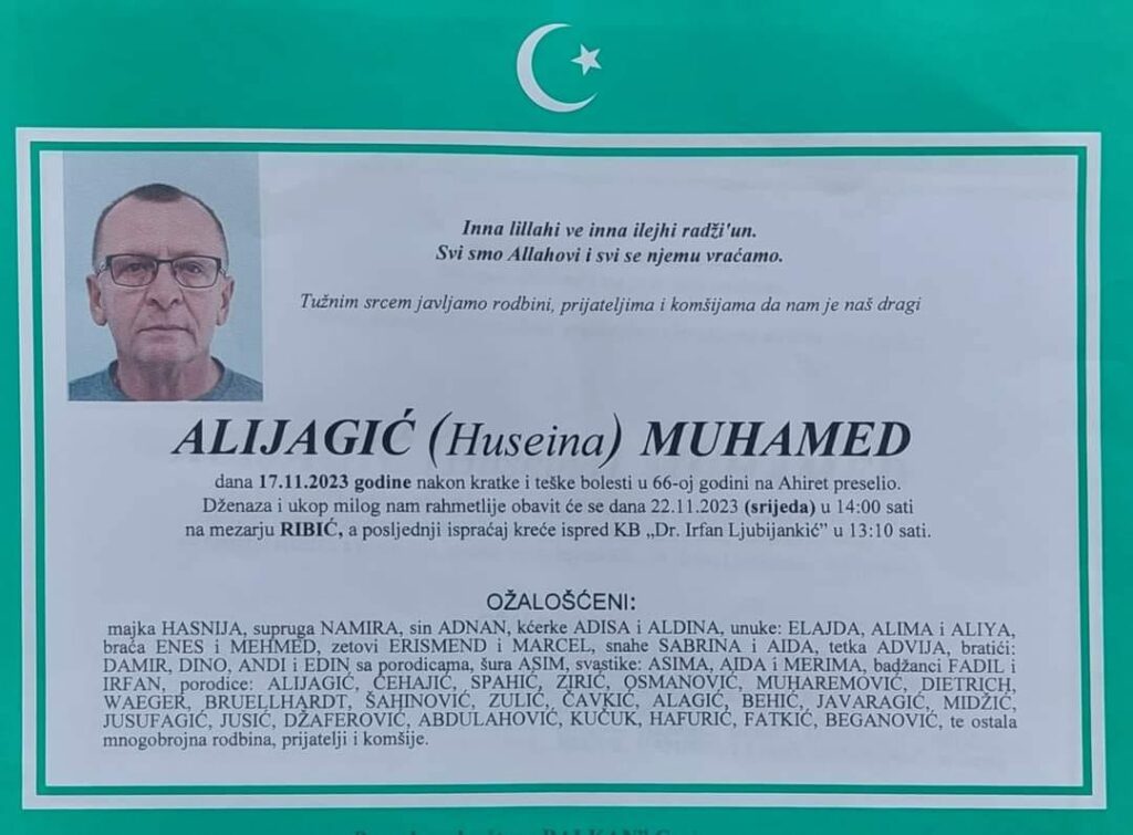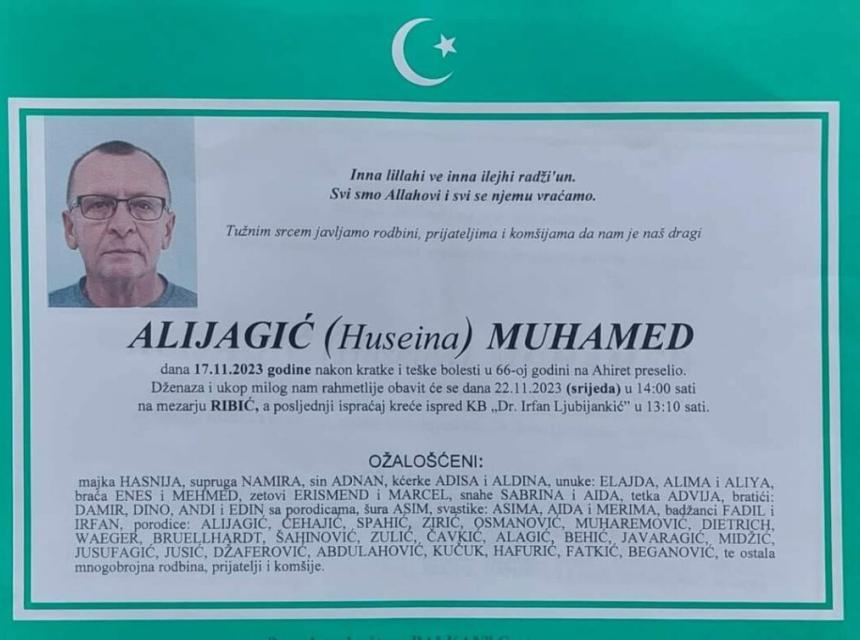 Tužnim srcem javljamo rodbini, prijateljima i komšijama da nam je naš dragi ALIJAGIĆ (Huseina) MUHAMED dana 17.11.2023 godine nakon kratke i teške bolesti u 66-oj godini na Ahiret preselio.