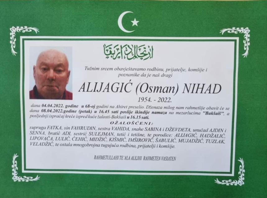 Tužnog srca i s bolom u duši obavještavamo rodbinu, komšije i prijatelje da je naš dragi Alijagić (Osman) Nihad u 68. godini života preselio na Ahiret.