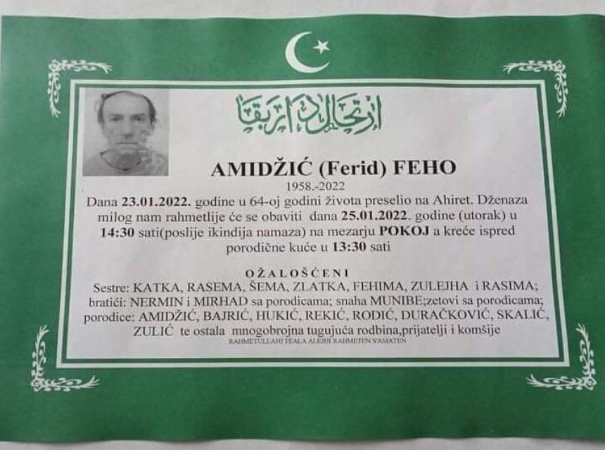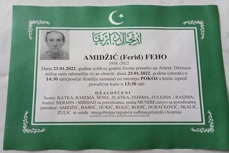 Tužnog srca i s bolom u duši obavještavamo rodbinu, komšije i prijatelje da je naš dragi Amidžić (Ferid) Feho 23.1.2022. u 64. godini života preselio na ahiret.