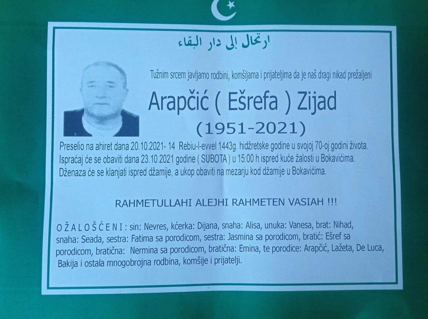 Tužnog srca i s bolom u duši obavještavamo rodbinu, komšije i prijatelje da je naš dragi Arapčić (Ešrefa) Zijad dana 20.10.2021. u 70. godini preselio na ahiret.