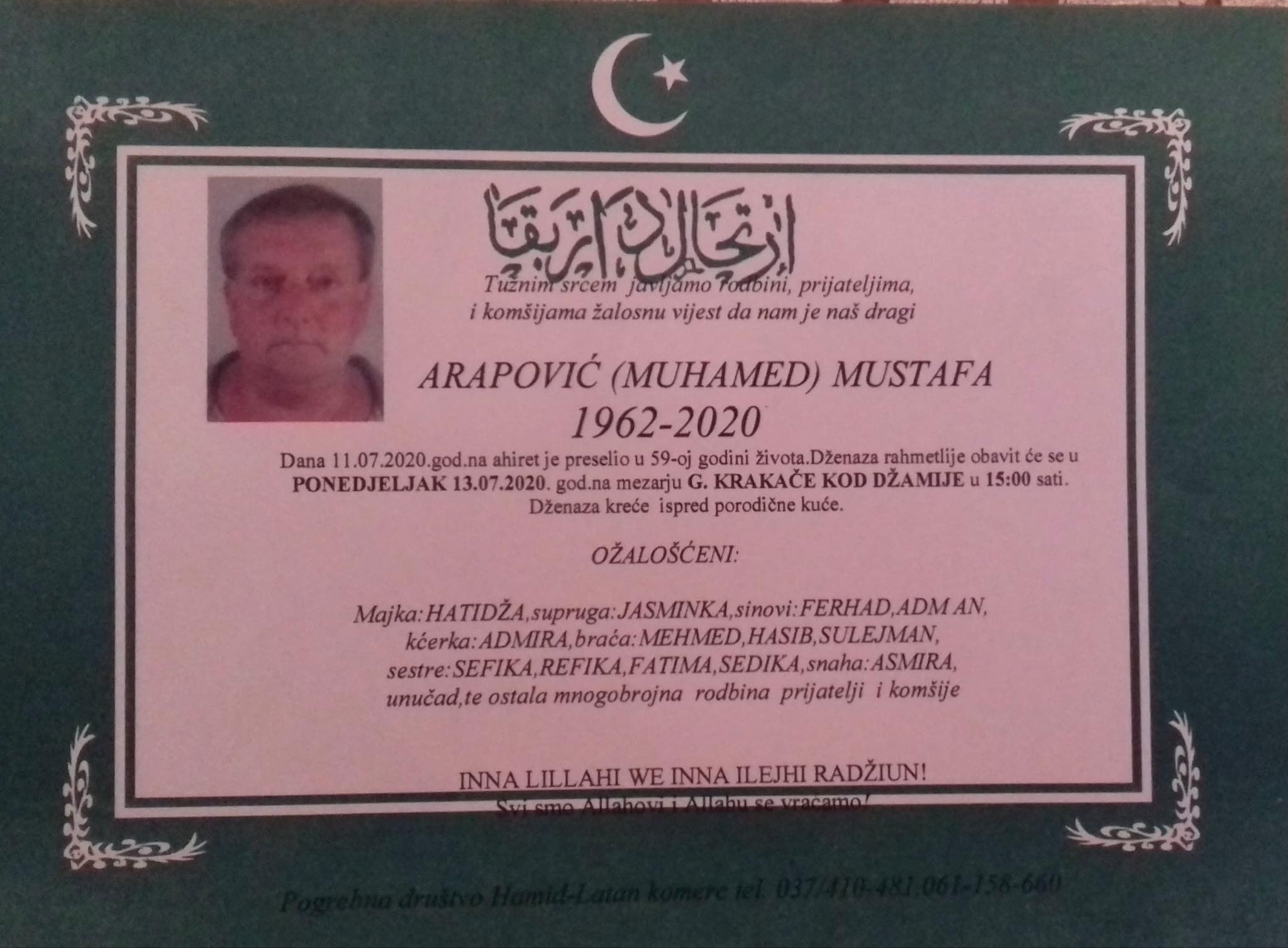 Tužnim srcem i bolom u duši javljamo rodbini i prijateljima da je dana 11.07.2020. godine u 59-oj godini života, na Ahiret preselio Arapović (Muhamed) Mustafa.