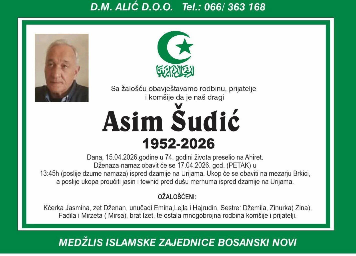 Dženaza-namaz obavit će se 17.04.2026. god. (PETAK) u 13:45h (poslije džume namaza) ispred džamije na Urijama.