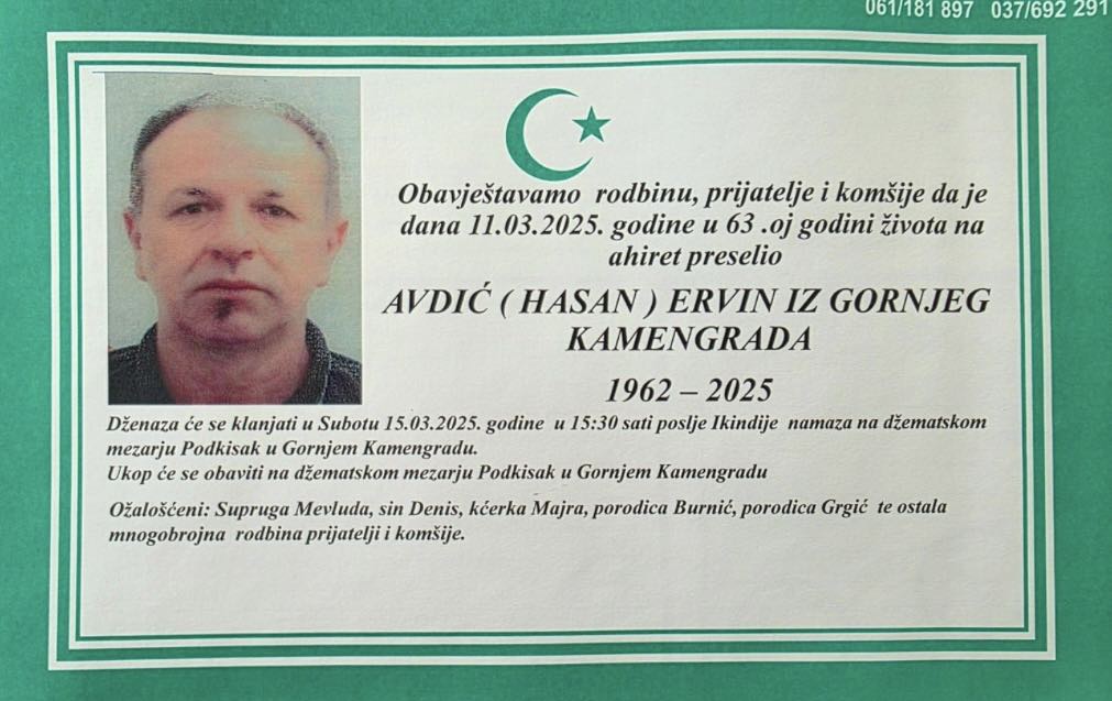 Obaviještavamo rodbinu, komšije i prijatelje da je dana 11.03.2025. godine u 63oj godini života na Ahiret preselio Avdić (Hasan) Ervin.
