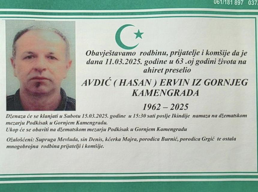 Dženaza će se klanjati u subotu 15.03.2025. godine u 15:30 sati poslije ikindije namaza na džematskom mezarju Podkisak u Gornjem Kamengradu, ukop će se obaviti na džematskom mezarju Podkisak u Gornjem Kamengradu.