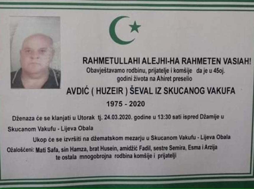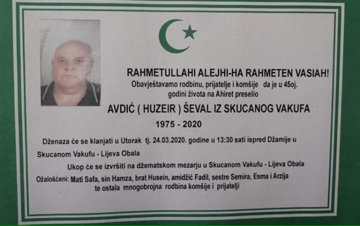 Teškim srcem i bolom u duši javljamo da je naš dragi i nikad prežaljeni Avdić (Huzeir) Ševal iz Skucanog Vakufa u 45-toj godini života preselio na Ahiret.