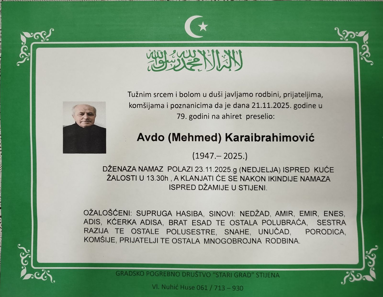 Tužnim srcem i bolom u duši javljamo rodbini, prijateljima, komšijama i poznanicima da je dana 21.11.2025. godine u 79. godini na ahiret preselio: Avdo (Mehmed) Karaibrahimović.