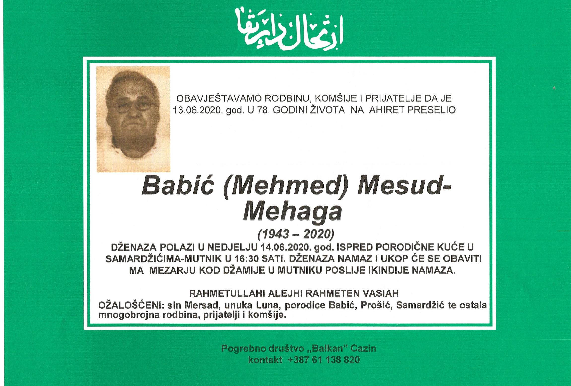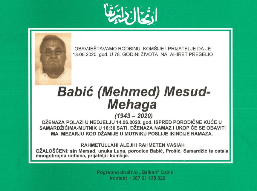 Teškim srcem i bolom u duši javljamo da je naš dragi i nikad prežaljeni Babić (Mehmed) Mesud-Mehaga dana 13.06.2020.godine u 78-oj godini života preselio na Ahiret.