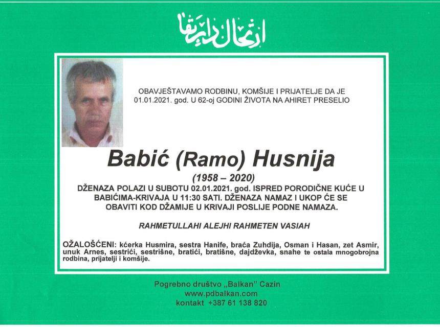 Tužnog srca i s bolom u duši obavještavamo rodbinu, komšije i prijatelje da je naš dragi Babić (Ramo) Husnija 01.01.2021. godine, u 62. godini života preselio na Ahiret.