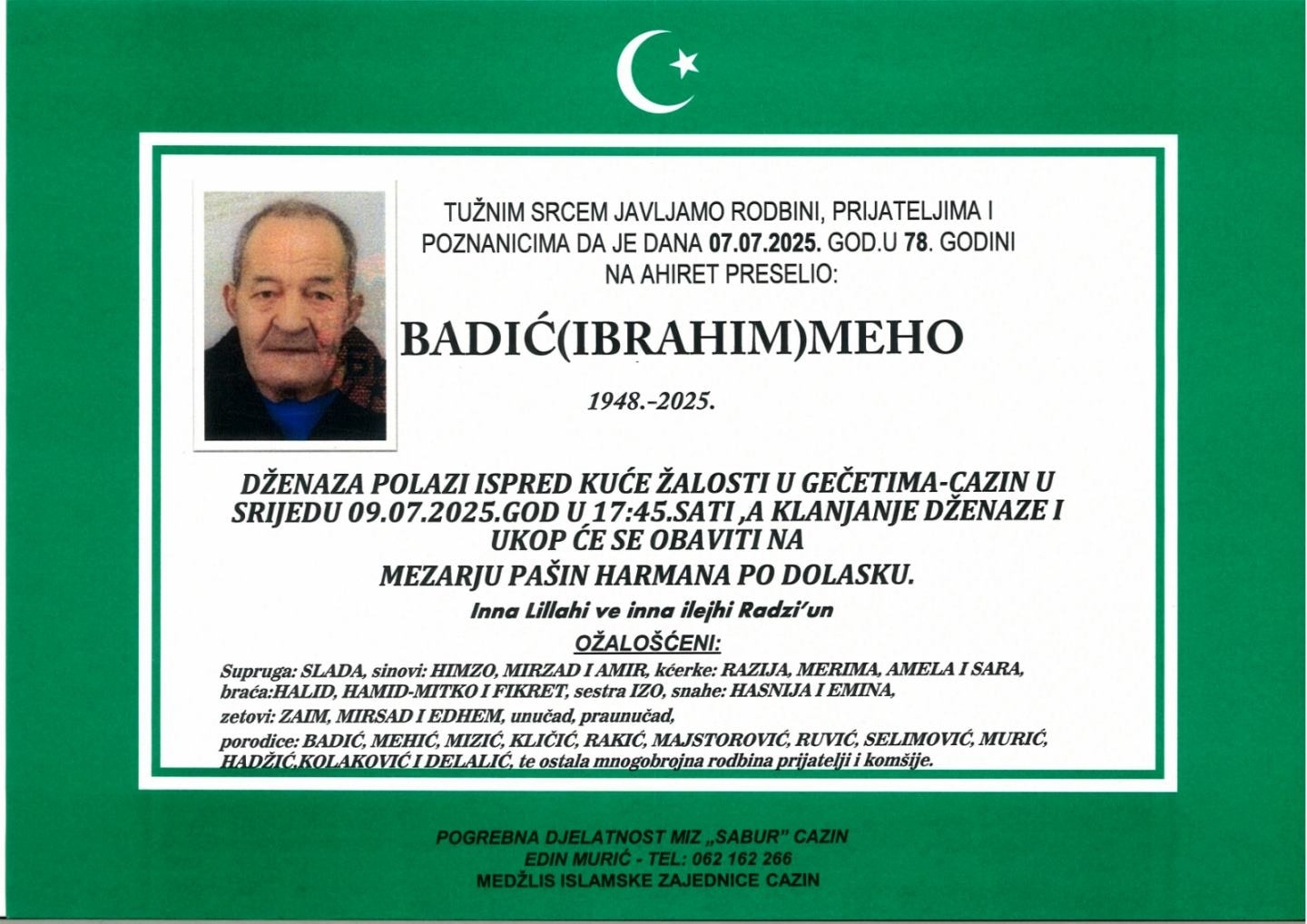 Dženaza polazi ispred kuće žalosti u GEČETIMA -a Cazin u srijedu 09.07.2025. u 17:45 sati, a klanjanje dženaze i ukop će se obaviti na mezarju PAŠIN HARMANA po dolasku.