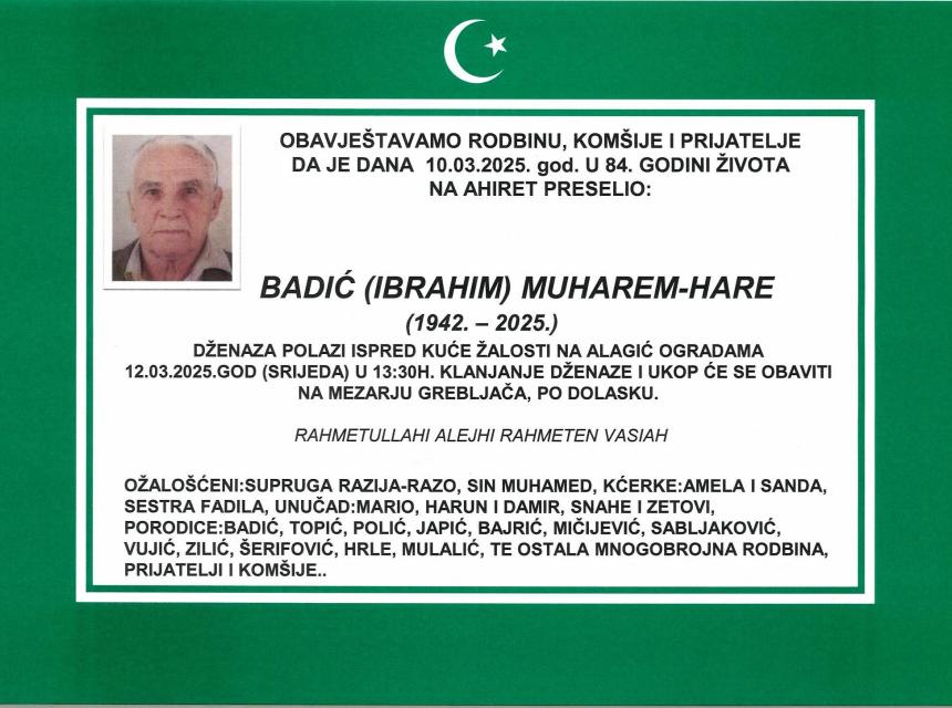OBAVJEŠTAVAMO RODBINU, KOMŠIJE I PRIJATELJE DA JE DANA 10.03.2025.god. U 84-oj GODINI ŽIVOTA NA AHIRET PRESELIO: