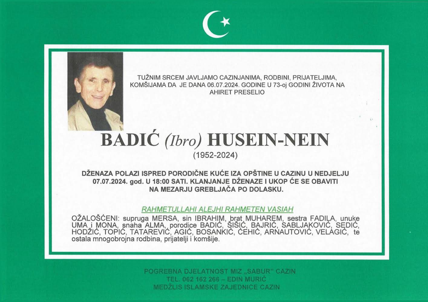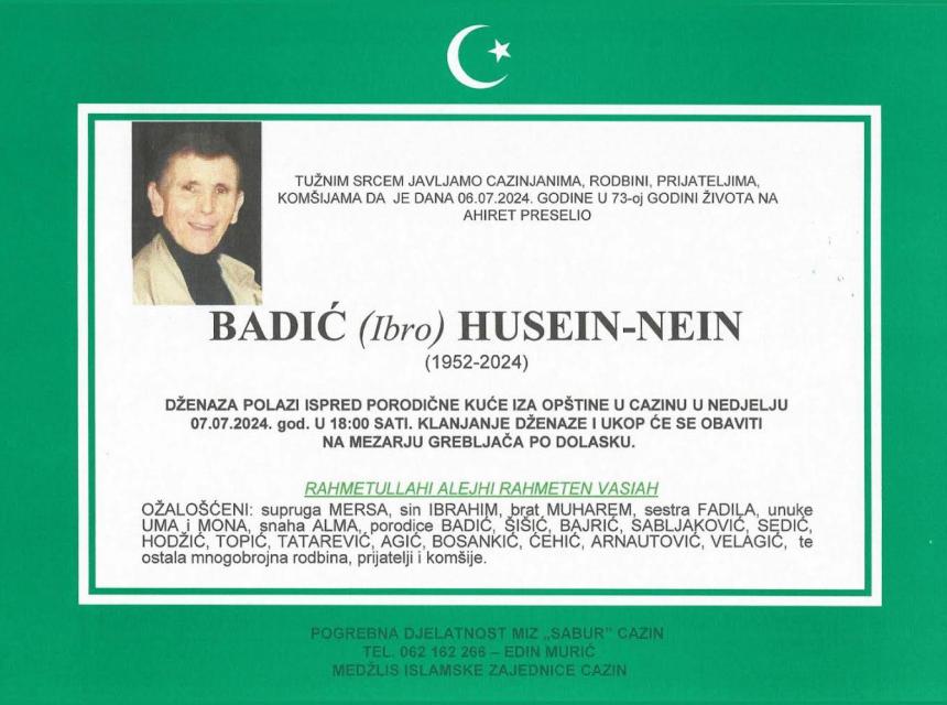 OBAVIJEST O SMRTI 06 Jul, 2024 - 21:09 / Uredio: Medina / 0 Comments Na ahiret preselio BADIĆ (Ibro) HUSEIN-NEIN obavijesti o smrti Related Articles OBAVIJEST O SMRTI 05 Dec, 2025 Na Ahiret preselila Smlatić (Mulalić) Vahida OBAVIJEST O SMRTI 05 Dec, 2025 Na Ahiret preselila hadži Sebila (Bajraktarević) Ćaušević OBAVIJEST O SMRTI 05 Dec, 2025 Na Ahiret preselila Prasko (Velid) Edina OBAVIJEST O SMRTI 05 Dec, 2025 Na Ahiret preselila Handanagić (rođ. Durić) Esada–Enesa OBAVIJEST O SMRTI 05 Dec, 2025 Na Ahiret preselila Kapić (rođ. Abdić) Fatima OBAVIJEST O SMRTI 05 Dec, 2025 Na Ahiret preselila Nuhanović (Čazima) Sabina