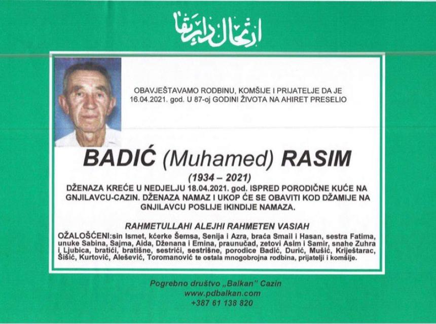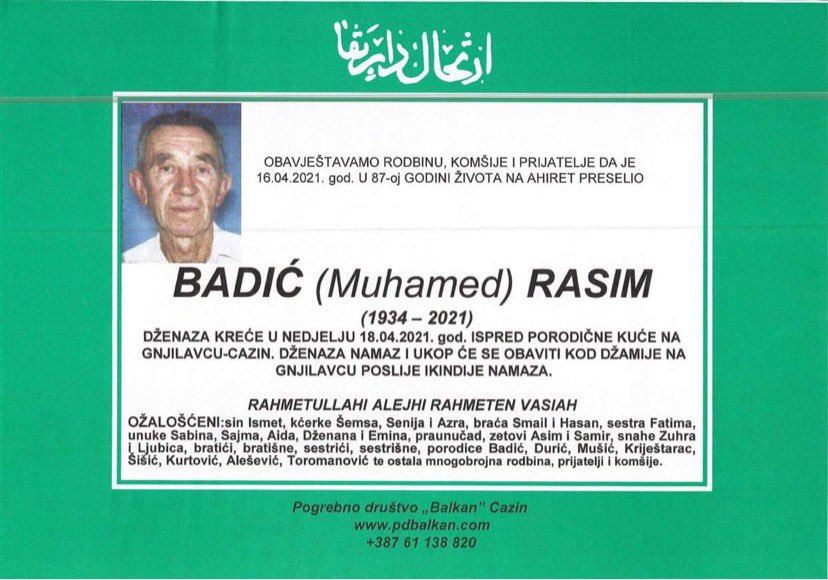Tužnog srca i s bolom u duši obavještavamo rodbinu, komšije i prijatelje da je naš dragi Badić (Muhamed) Rasim, 16.04.2021. godine, u 87. godini života preselio na Ahiret.