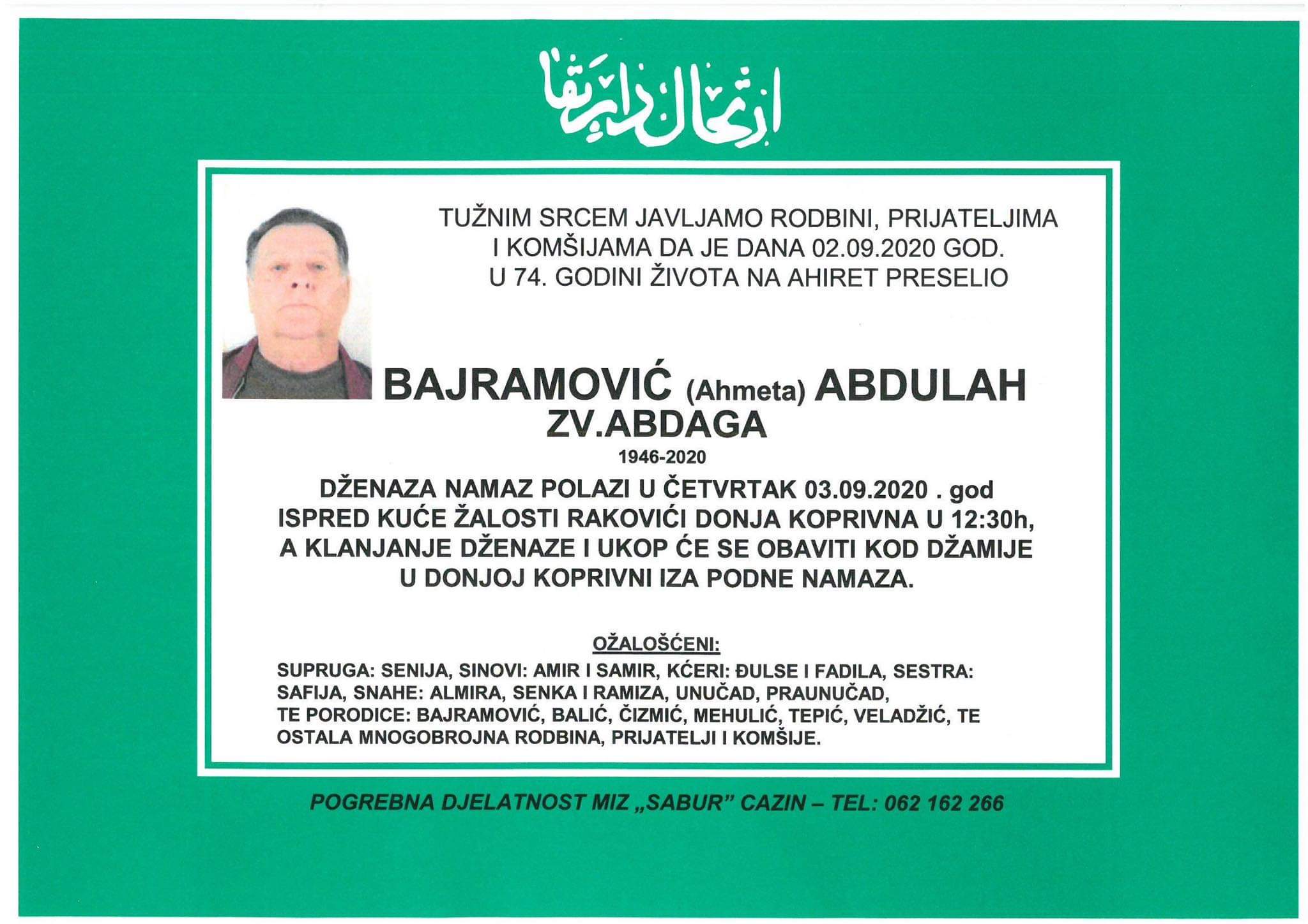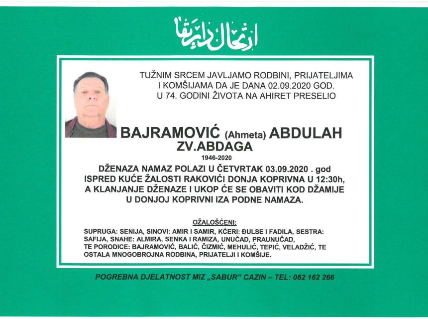 Tužnog srca i s bolom u duši obavještavamo rodbinu, komšije i prijatelje da je naš dragi Bajramović (Ahmeta) Abdulah zv. Abdaga, dana 02.09.2020. godine, u 74-oj. godini života, preselio na Ahiret.