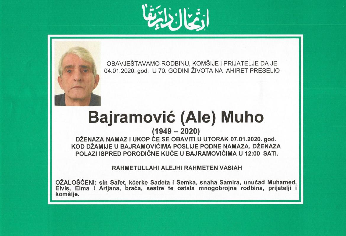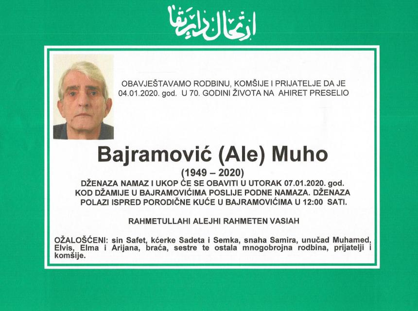 Tužnim srcem i bolom u duši javljamo rodbini i prijateljima da je dana 04.01.2020. godine u 70-oj godini života, na Ahiret preselio Bajramović (Ale) Muho.