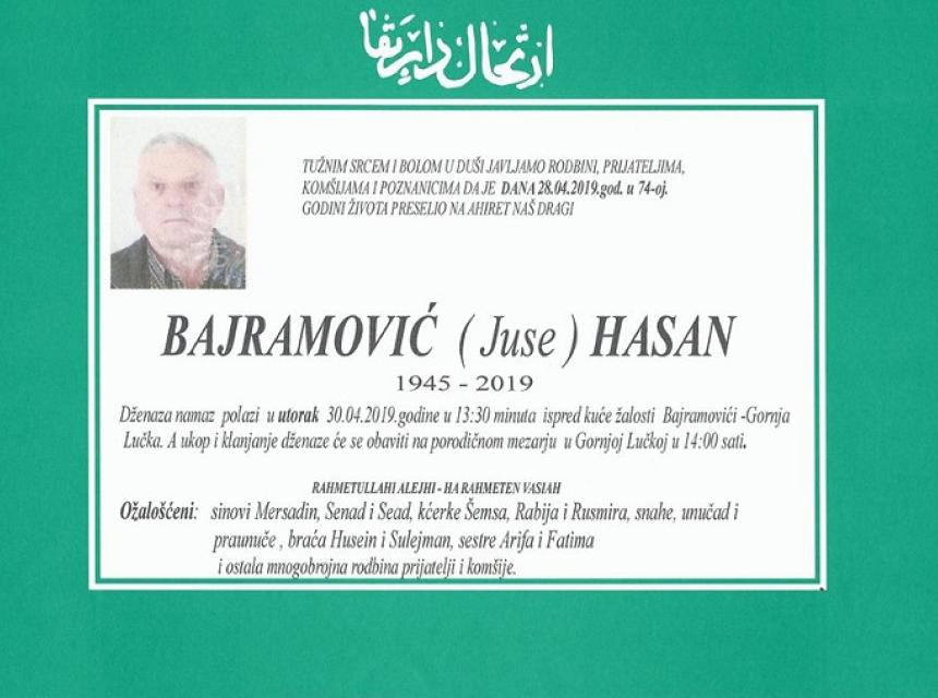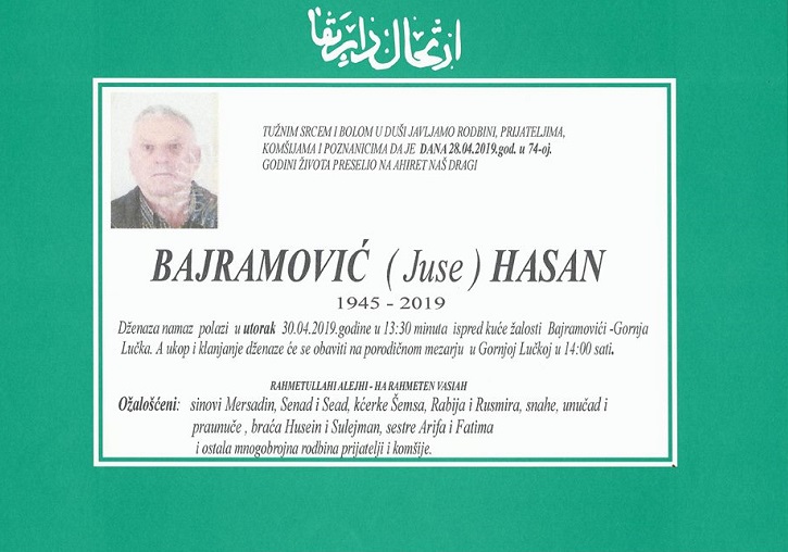 Tužnim srcem i bolom u duši javljamo rodbini, prijateljima, komšijama i poznanicima da je dana 28.04.2019. godine u 74. godini života na Ahiret preselio naš dragi Bajramović (Juse) Hasan.