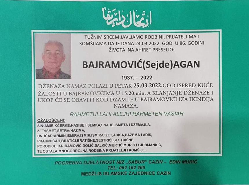 Dženaza namaz polazi u petak 24.03.2022. godine ispred kuće žalosti u Bajramovićimau 15:20 min a klanjanje će se obaviti kod džamije u Bajramovići iza ikindija namaza.