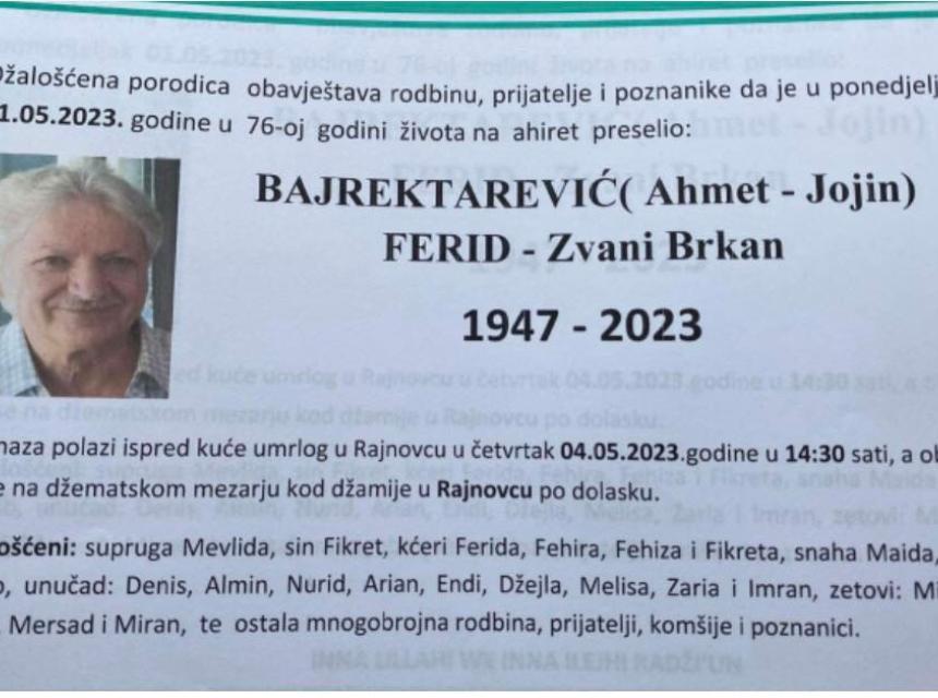 Obavještavamo rodbinu , prijatelje i komsije da je dana 01.05.2023. godine u 76-oj godini zivota na Ahiret preselio Bajrektarević (Ahmet - Jojin) Ferid zvani Brkan.