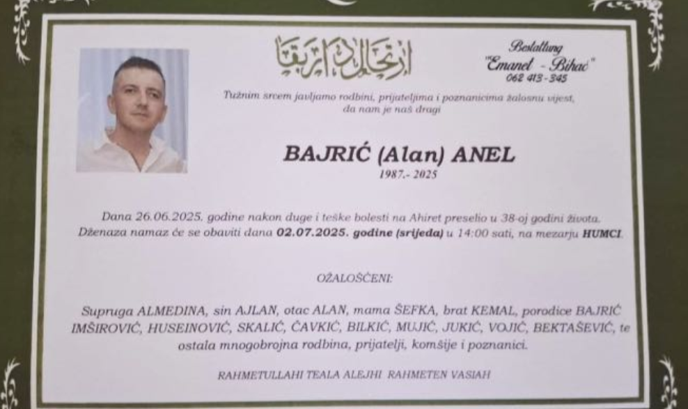Obavještavamo rodbinu i prijatelje da je 26. juna na Ahiret u 38. godini života preselio Bajrić (Alan) Anel.