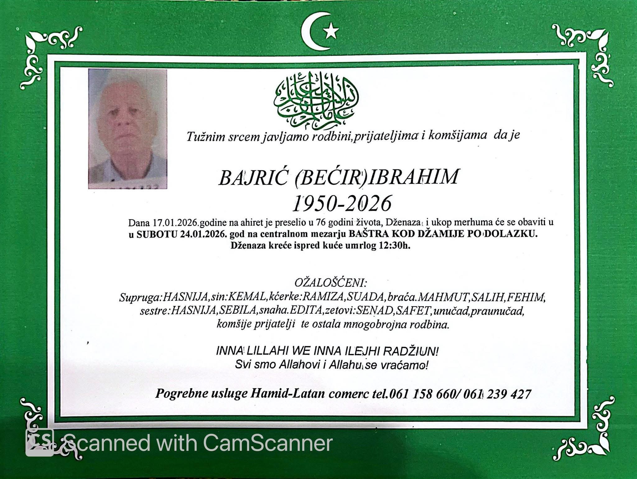 Dženaza i ukop merhuma će se obaviti u subotu, 24.01.2026. godine, na centralnom mezarju Baštra kod džamije, po dolasku.
