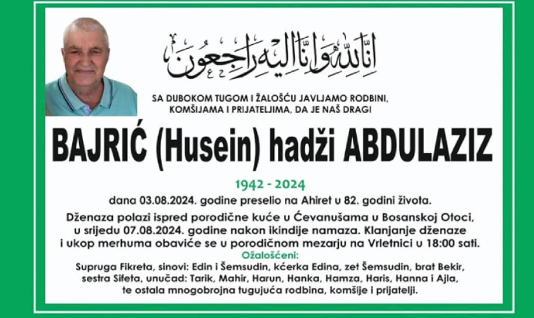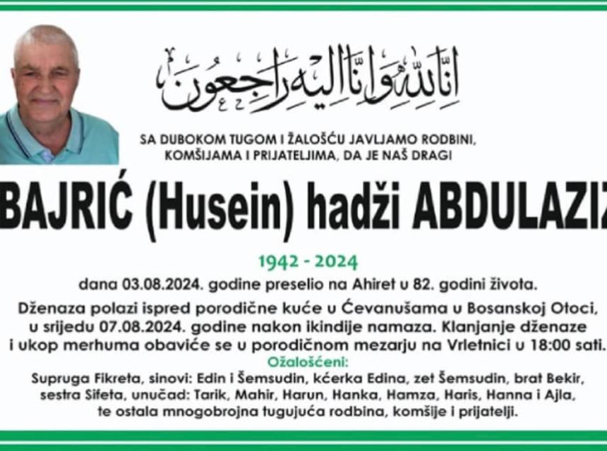 Tužnim srcem i bolom u duši javljamo rodbini, prijateljima i komšijama da je naš dragi Bajrić (Husein) hadži Abdulaziz, dana 03.08.2024. godine u 82-oj godini života u Americi, preselio na Ahiret.