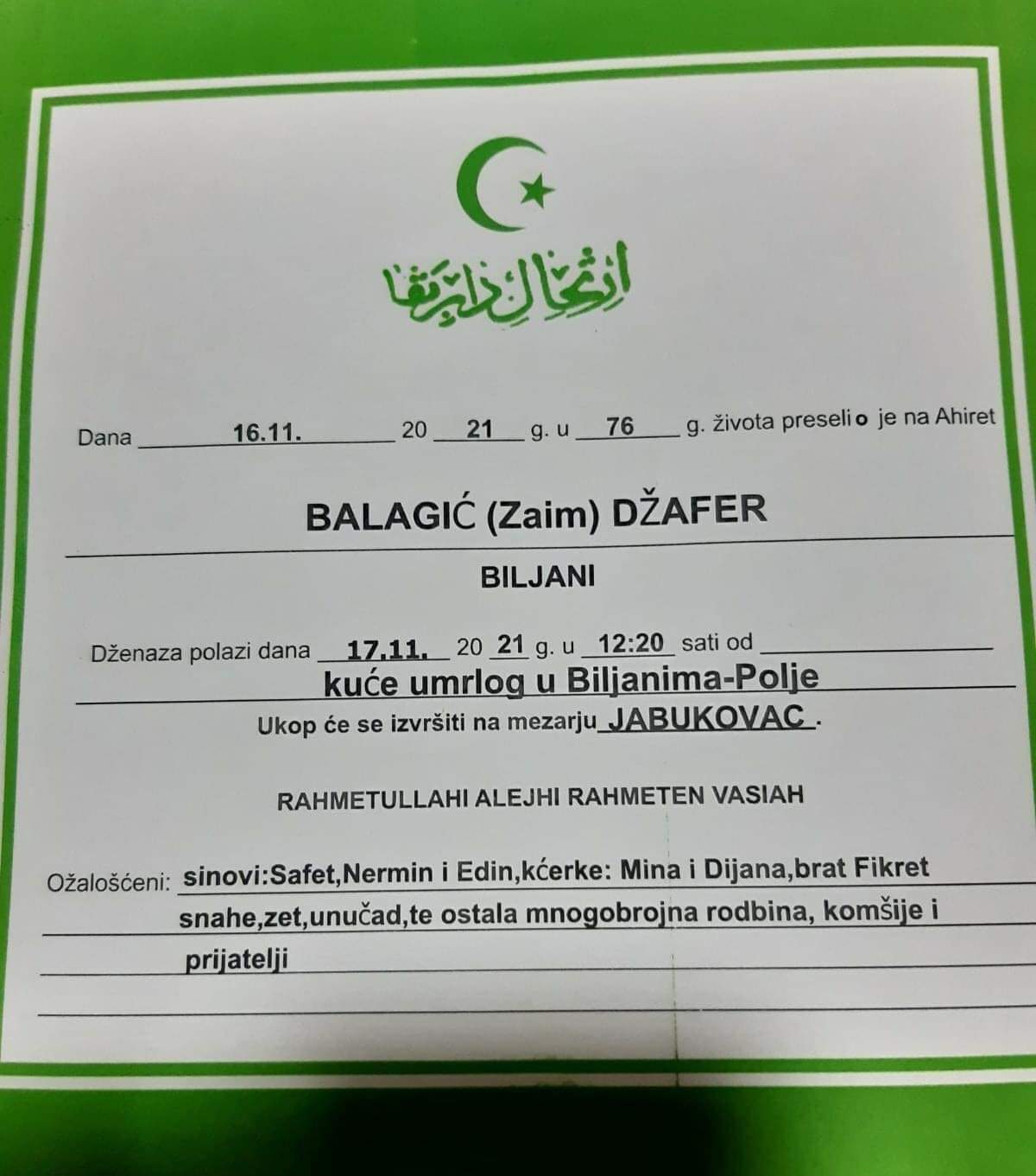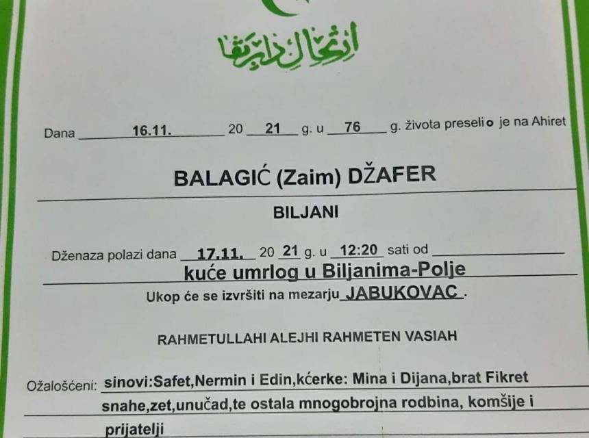 Tužnog srca i s bolom u duši obavještavamo rodbinu, komšije i prijatelje da je naš dragi qBalagić (Zaim) Džafer dana 16.11.2021. u 76. godini života preselio na ahiret.