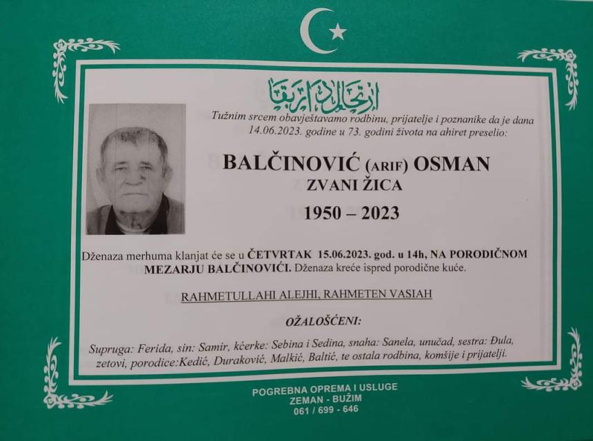 Ožalošćena porodica obaveštava rodbinu, prijatelje i poznanike da je 14.06.2023. godine u 76-oj godini zivota na Ahiret preselio Balčinović (Arif) Osman