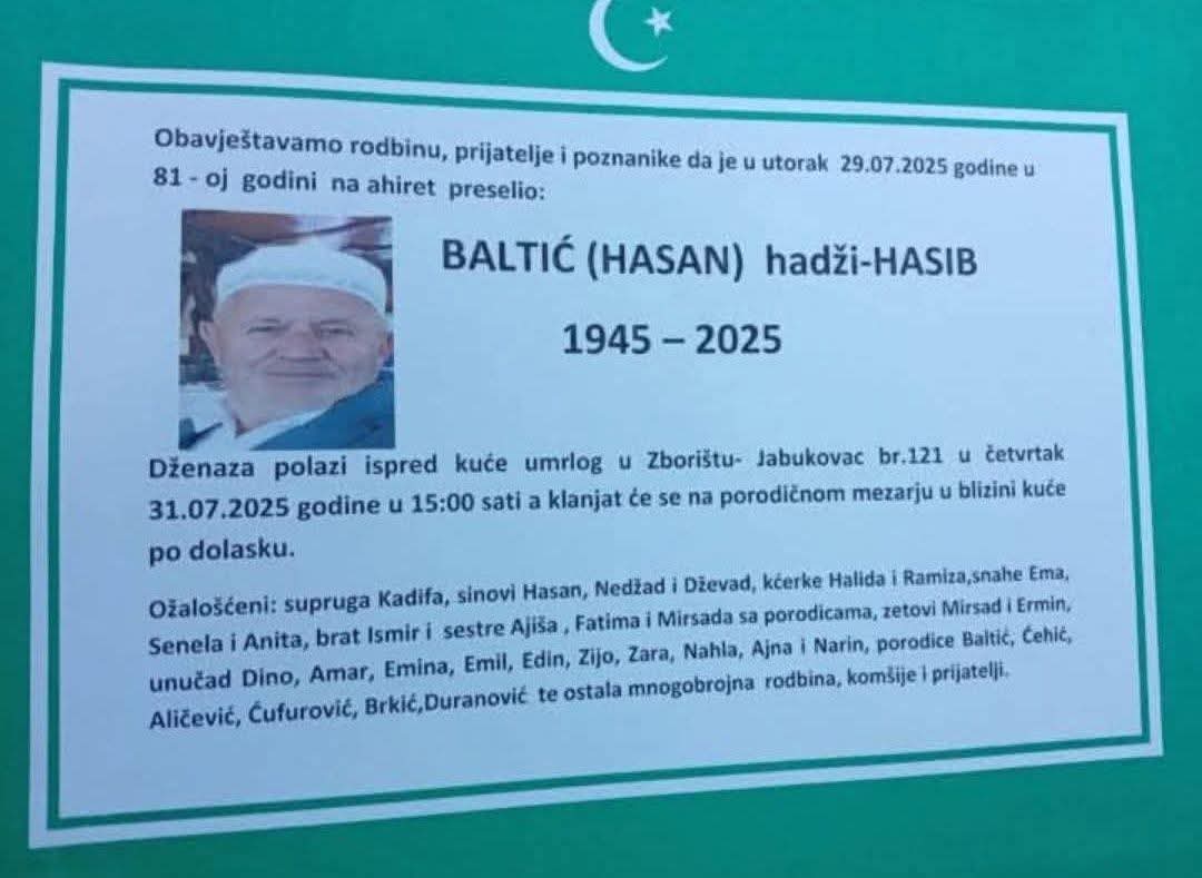 Dženaza polazi ispred kuće umrlog u Zborištu – Jabukovac br. 121 u četvrtak 31.07.2025. godine u 15:00 sati i klanjat će se na porodičnom mezarju u blizini kuće po dolasku.