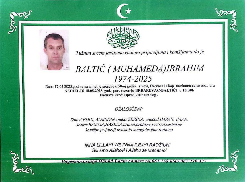 Tužnim srcem i bolom u duši javljamo rodbini, prijateljima i komšijama da je naš dragi Baltić (Muhameda) Ibrahim, dana 17.05.2025. godine u 50-oj godini života, preselio na Ahiret.