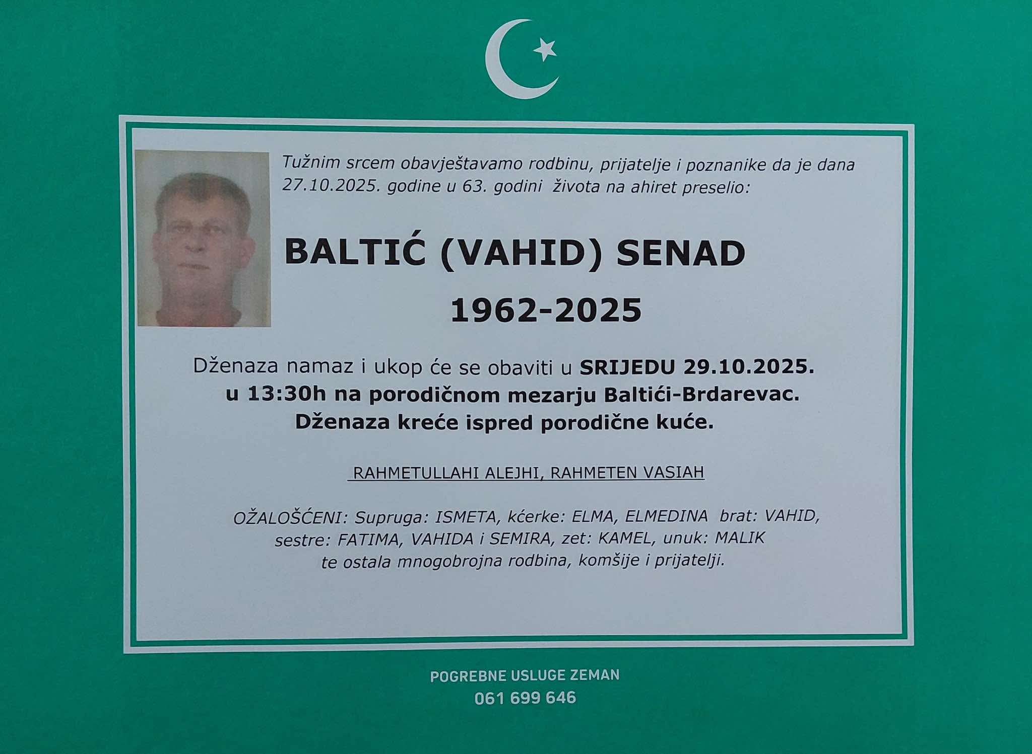 Dženaza namaz i ukop će se obaviti u SRIJEDU 29.10.2025. u 13:30h na porodičnom mezarju Baltići–Brdarevac.