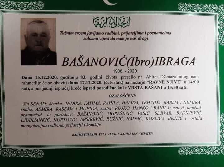 Tužnog srca i s bolom u duši obavještavamo rodbinu, komšije i prijatelje da je naš dragi Bašanović (Ibro) Ibraga 15. decembra 2020. godine, u 83. godini života preselio na Ahiret.