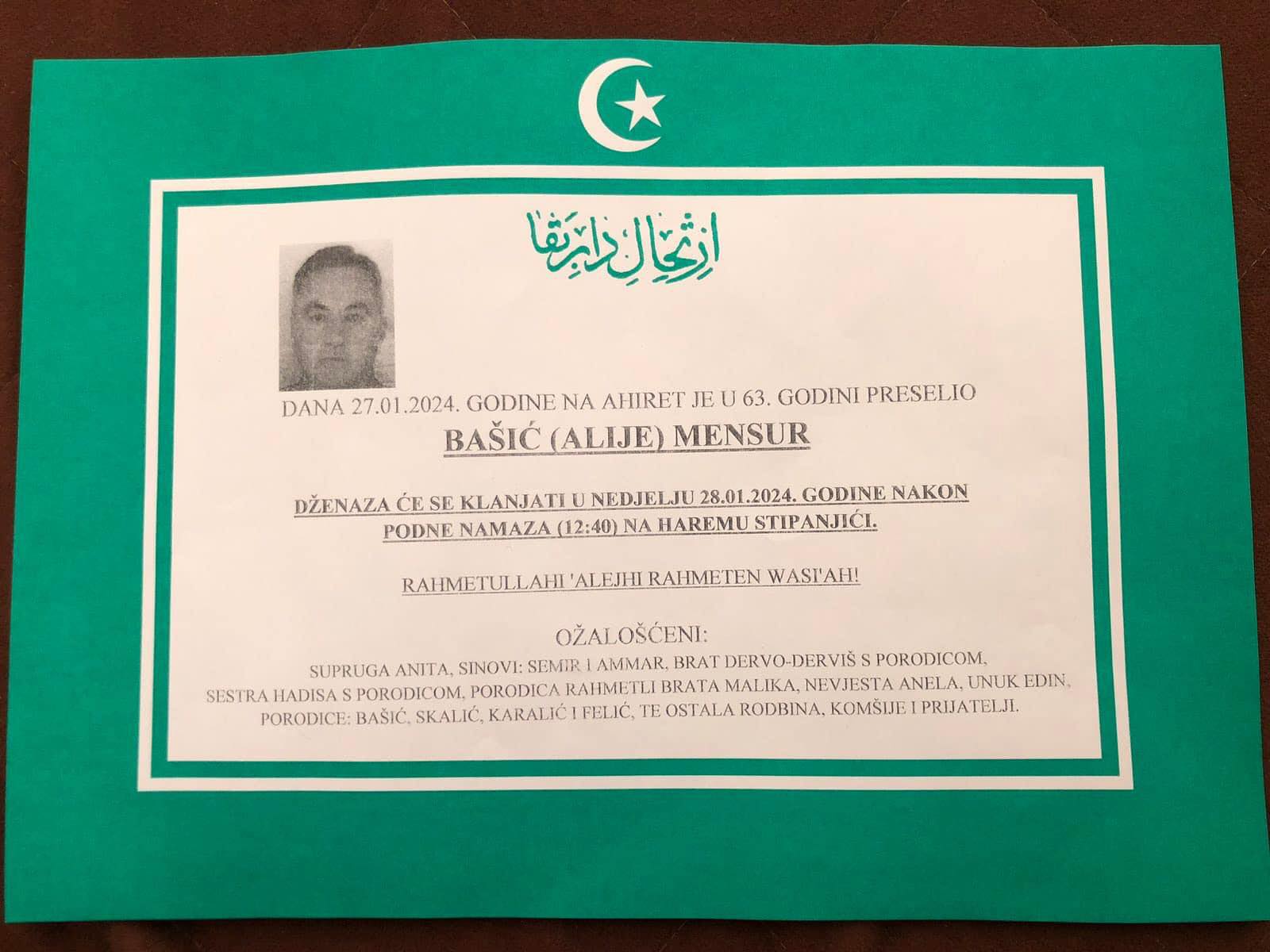 Tuznim srcem javljamo rodbini, prijateljima i poznanicima zalosnu vijest da nam je nas dragi Bašić (Alije) Mensur, dana 27.01.2024 godine u 63-oj godini na Ahiret preselio.