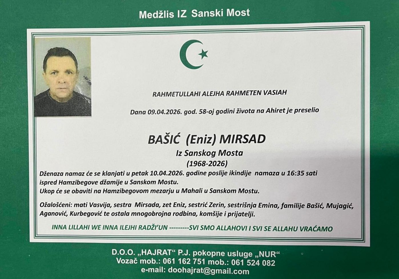 Dženaza namaz će se klanjati u petak 10.04.2026. godine poslije ikindije namaza u 16:35 sati ispred Hamzibegove džamije u Sanskom Mostu.