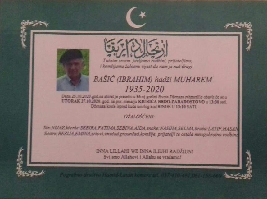 Tužnog srca i s bolom u duši obavještavamo rodbinu, komšije i prijatelje da je naš dragi Bašić (Ibrahim) hadži Muharem 25. oktobra 2020. godine, u 86. godini života, preselilo na Ahiret.