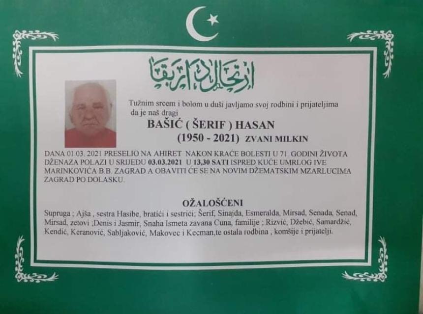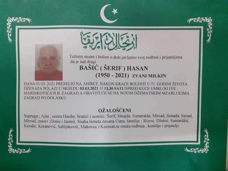 Tužnog srca i s bolom u duši obavještavamo rodbinu, komšije i prijatelje da je naš dragi Bašić (Šerif) Hasan zv. Milkin, dana 01.03.2021 godine, u 71-oj godini života, preselio na Ahiret.