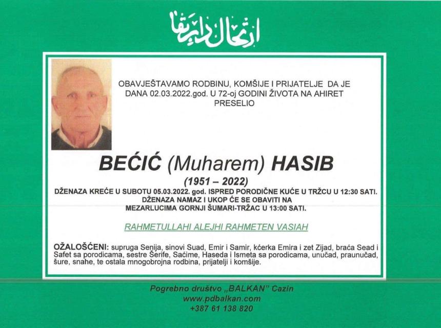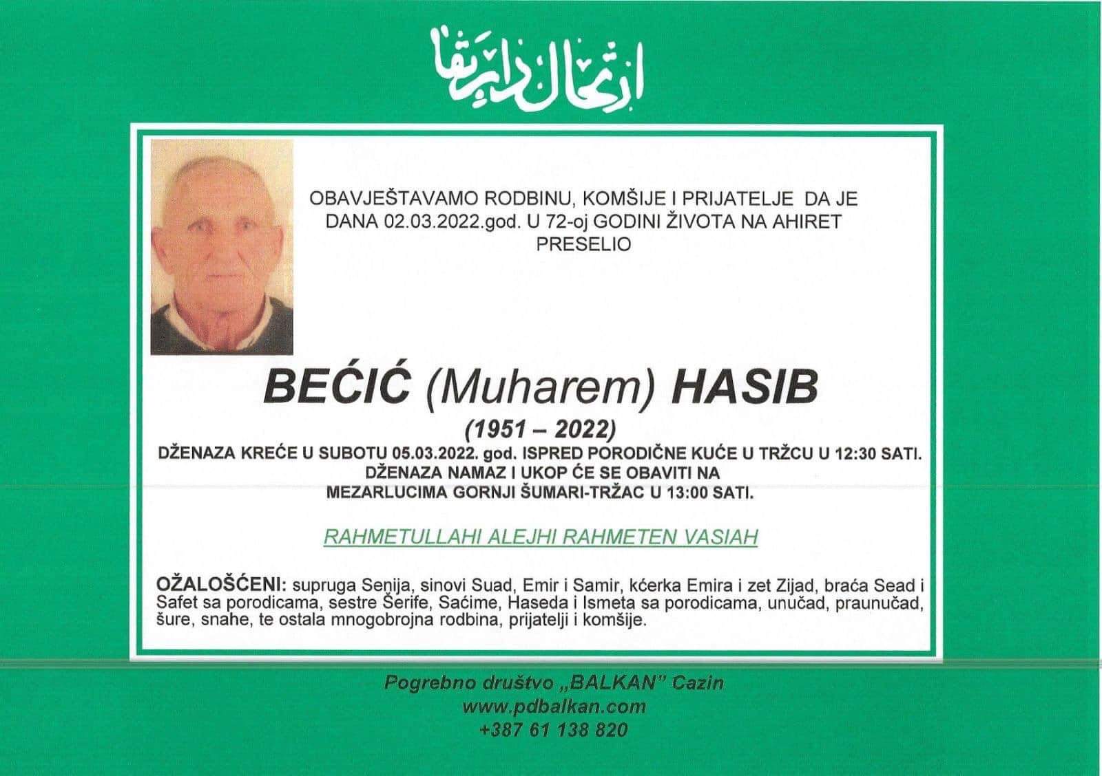Tužnog srca i s bolom u duši obavještavamo rodbinu, komšije i prijatelje da je naš dragi Bečić (Muharem) Hasib 02.03.2022. u 72. godini života preselio na Ahiret.