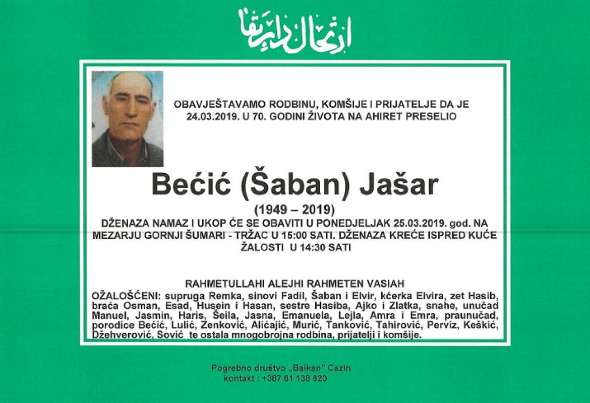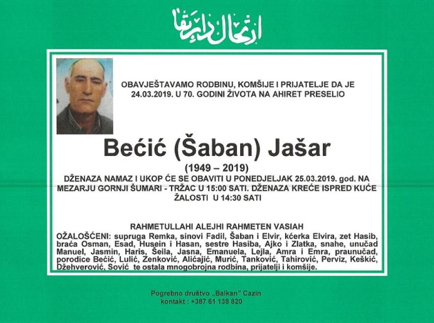 Obavještavamo rodbinu, komšije i prijatelje da je 24.03.2019. u 70. godini života na Ahiret preselio Bečić (Šaban) Jašar.